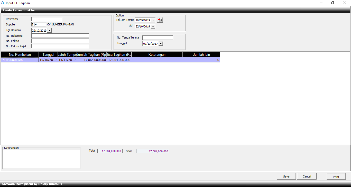 Tanda Terima Faktur ini berfungsi untuk merangkum faktur-faktur pembelian yang akan dilakukan pembayaran, bisa berdasarkan tanggal jatuh tempo faktur maupun berdasarkan nomor faktur. Tanda Terima Faktur ini dibuat per Supplier agar rincian hutang per Supplier lebih jelas, menu ini nantinya akan digunakan sebagai bahan untuk pembayaran hutang kepada supplier. Bisa di rekap di menu rekap tanda terima faktur .