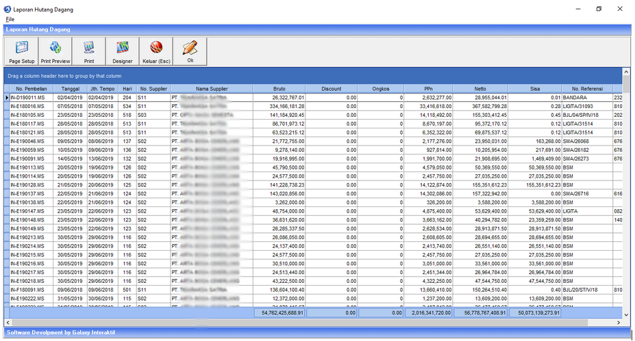 Menu ini menampilkan data hutang distributor kepada semua Supplier, data yang ditampilkan sangatlah rinci karena jika melakukan doubleclick pada salah satu record akan menampilkan invoice atas pembelian yang telah dilakukan. Buka Modul Hutang >> Data Hutang.