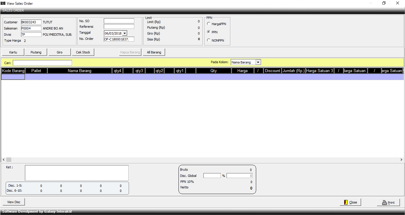 Menu ini digunakan untuk menginput data pesanan penjualan dari customer, Sales Order ini nantinya akan ditarik ke Faktur TO untuk dibuatnya data penjualan. Saat input Sales Order ini belum mengurangi data barang digudang dan belum menambah jumlah piutang.