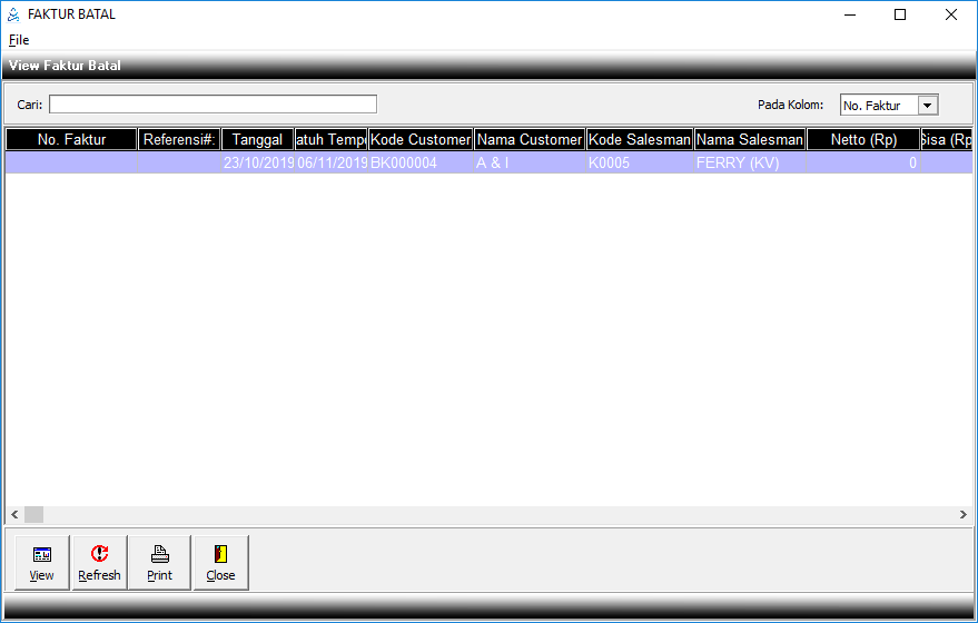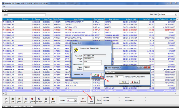 Setelah semua status selesai di input, maka selanjutnya adalah menginput hasil dari status agar mengurangi nilai dari penjualan yang telah dilakukan dan menambahnya ke gudang. Faktur Batal ini untuk menampilkan Faktur-faktur dari supir yang mengalami tolakan dari customer.