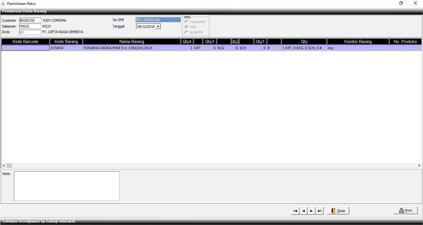 menu untuk membuat daftar permintaan retur barang dari customer tertentu, karena adanya suatu hal seperti barang rusak atau cacat. Digunakan salesman untuk mencatat barang retur dari toko. Yang dibuat oleh divisi gudang, yang akan diberikan oleh supir sebagai bukti penarikan barang ke customer. Yang dimana harus di ttd oleh kepala spv, salesman, kepala gudang, supir dan toko. Syarat utama customer untuk melakukan retur barang.