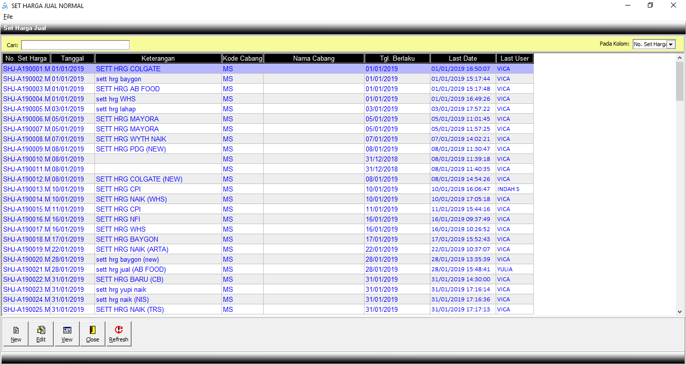 Klik 2x untuk mengambil kode cabang yang harga jual barangya akan diubah. |