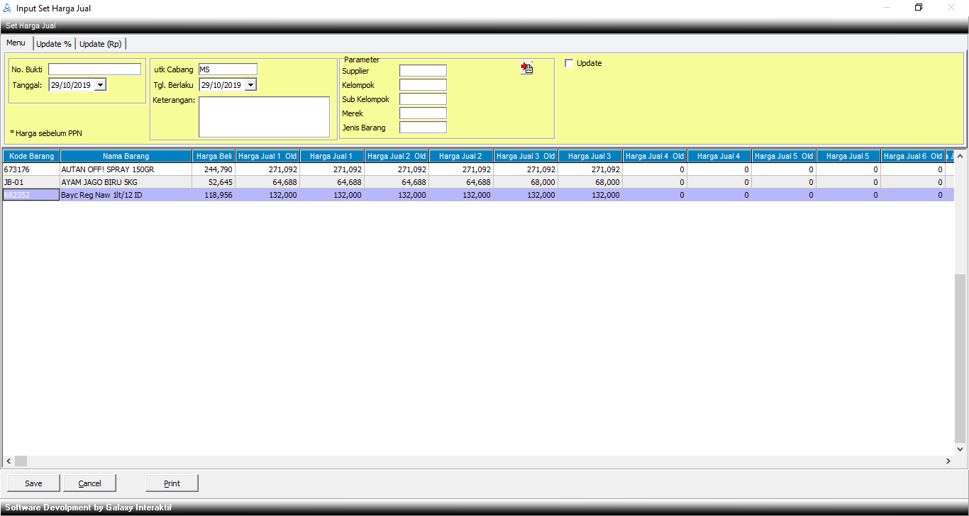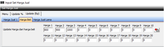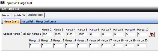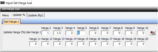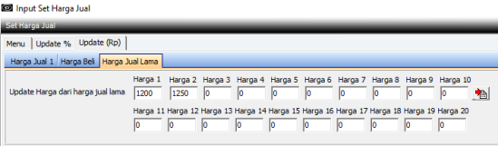 Menu ini digunakan untuk mengubah Harga Jual 1 s/d Harga Jual 20 untuk cabang yang diambil. Set Harga Jual akan berlaku jika sudah dilakukan update, namun setelah dilakukan update Set Harga tersebut tidak dapat diubah lagi. Digunakan jika ada kenaikan maupun penurunan harga jual.