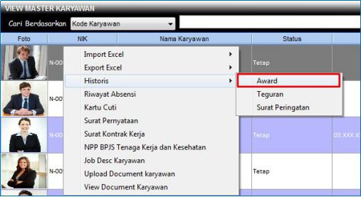 2. Maka tampil jendela View Master Karyawan, pilih kode karyawan yang histori sp nya akan ditampilkan kemudian klik kanan dan pilih Histori -> Award.