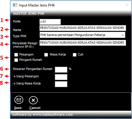 - Jenis PHK tidak boleh dihapus atau diubah kodenya jika sudah dipakai pada data Pengunduran Diri, karena akan mengakibatkan Pengunduran Diri berantakan.