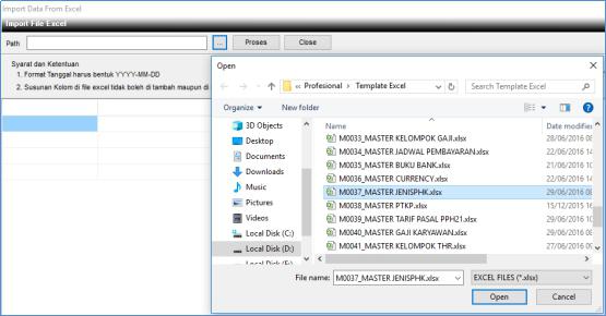 3. Maka muncul jendela Import File Excel,  pilih  elipsis untuk mengambil file yang akan diimport dengan nama file M0020_MASTER JENISPHK.xlsx (harus ada di folder Template Excel).