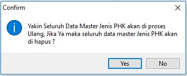 4. Klik Proses untuk mulai melakukan proses import, maka akan tampil pemberitahuan sebagai berikut. Pilih Yes  untuk melanjutkan (seluruh data master Jenis PHK yang lama akan terhapus) atau No  untuk membatalkan.