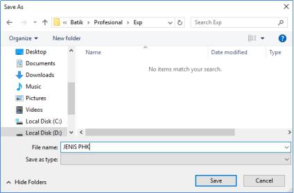 2. Maka muncul jendela untuk menyimpan file export, pilih folder kemudian isi nama file dan extention file kemudian klik Save  untuk menyimpan.