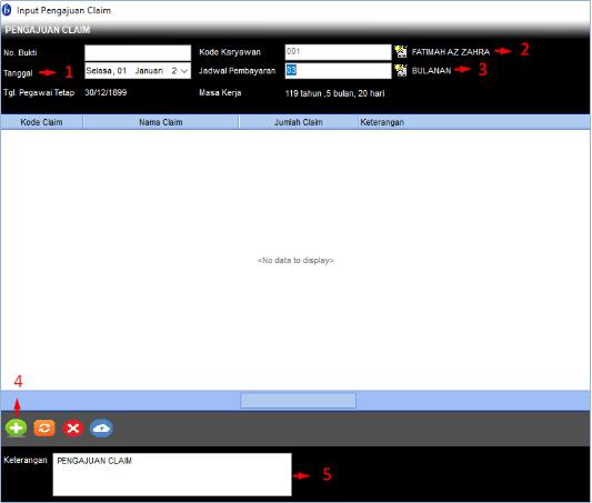 Masing-masing karyawan bisa menginput pengajuan claim atas biaya yang ia keluarkan untuk kepentingan perusahaan sesuai dengan kebijakan perusahaan. Claim ini terkait dengan Master Data Karyawan pada Tab Claim, hanya claim yang diinput pada masing-masing Data Karyawan yang bisa diclaim sesuai NIK yang diambil.