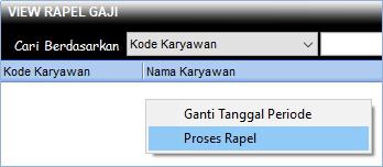 1. Buka Modul Gaji -> Transaksi -> Rapel Gaji, klik kanan tampilan kemudian pilih Proses Rapel.