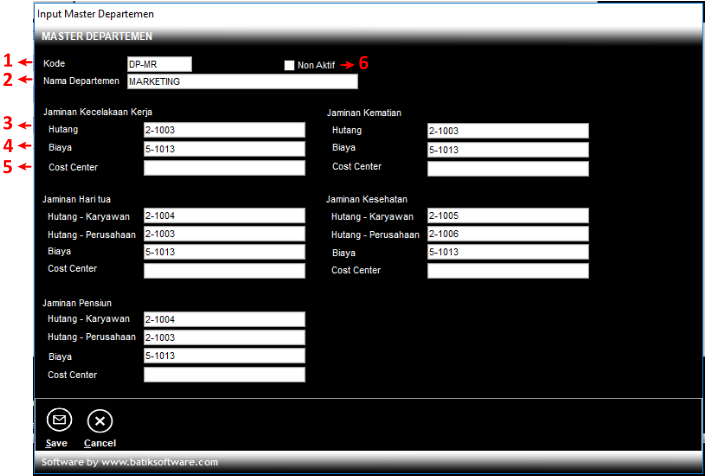 | 1 | Kode | Diisi kode departemen maksimal 5 karakter |