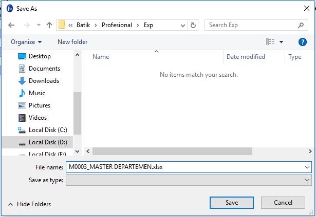 2. Maka muncul jendela untuk menyimpan file export, pilih folder kemudian isi nama file dan extention file kemudian klik Save untuk menyimpan.