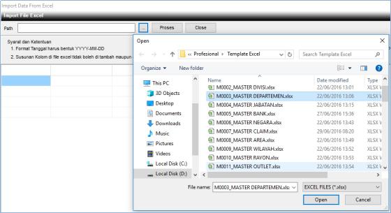 3. Maka muncul jendela Import File Excel, pilih Elipsis untuk mengambil file yang akan diimport dengan nama file M0003_MASTER DEPARTEMEN.xls (harus ada di folder Template Excel).