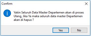 4. Klik Proses untuk mulai melakukan proses import, maka akan tampil pemberitahuan sebagai berikut. Pilih Yes untuk melanjutkan (seluruh data master Departemen yang lama akan terhapus) atau No untuk membatalkan.