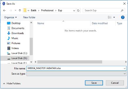 2. Maka muncul jendela untuk menyimpan file export, pilih folder kemudian isi nama file dan extention file kemudian klik Save untuk menyimpan.