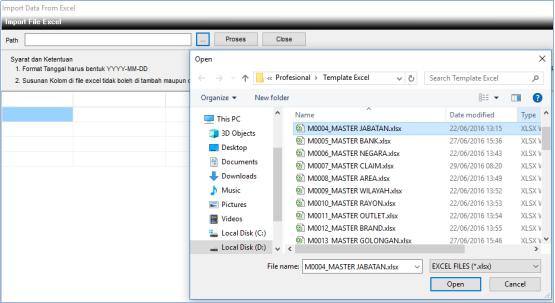 3. Maka muncul jendela Import File Excel, pilih Elipsis untuk mengambil file yang akan diimport dengan nama file M0004_MASTER JABATAN.xls (harus ada di folder Template Excel).